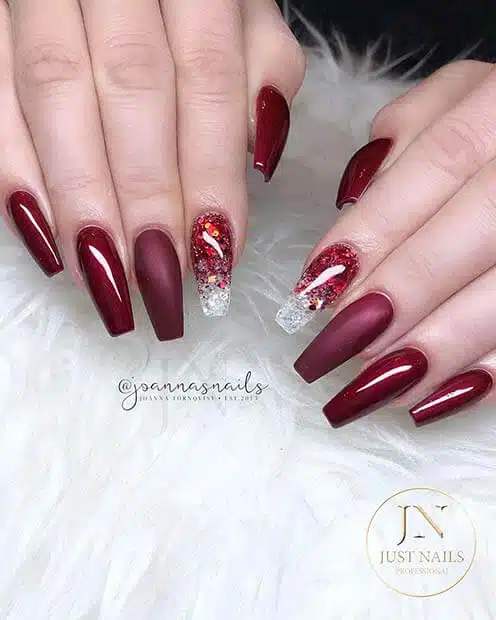 The very first deep red nails suggestion is the one we’ve got to offer you. This style features matte burgundy nails with glossy dark red nails and an ombre of dark red glitter. We love the variety of textures as well as the combination of dark shades. A glamorous and fun manicure.
