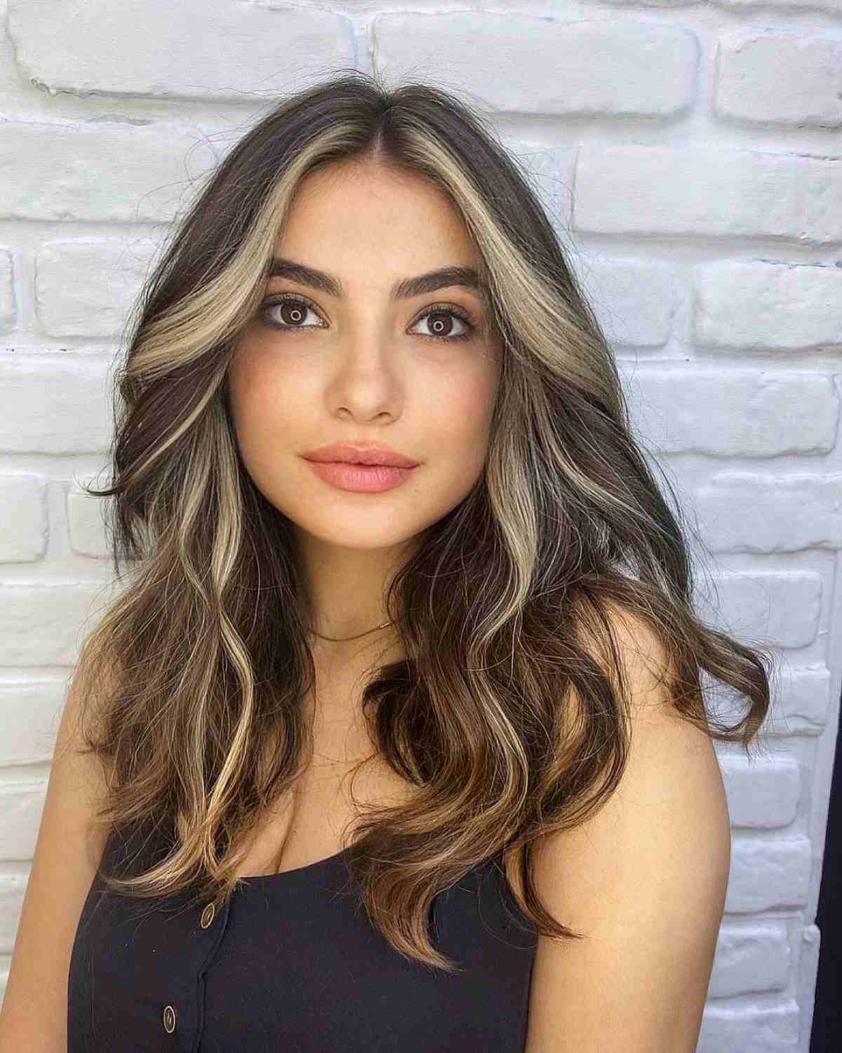 Dimensional dark blonde highlights add depth and texture to brown hair, creating a gorgeous gradient effect. This look compliments round and heart-shaped faces by drawing attention to your cheekbones and softening your overall appearance. The blend of cool blonde tones with mocha brown adds a sunlit glow, making it perfect for anyone seeking a natural yet multi-dimensional style.