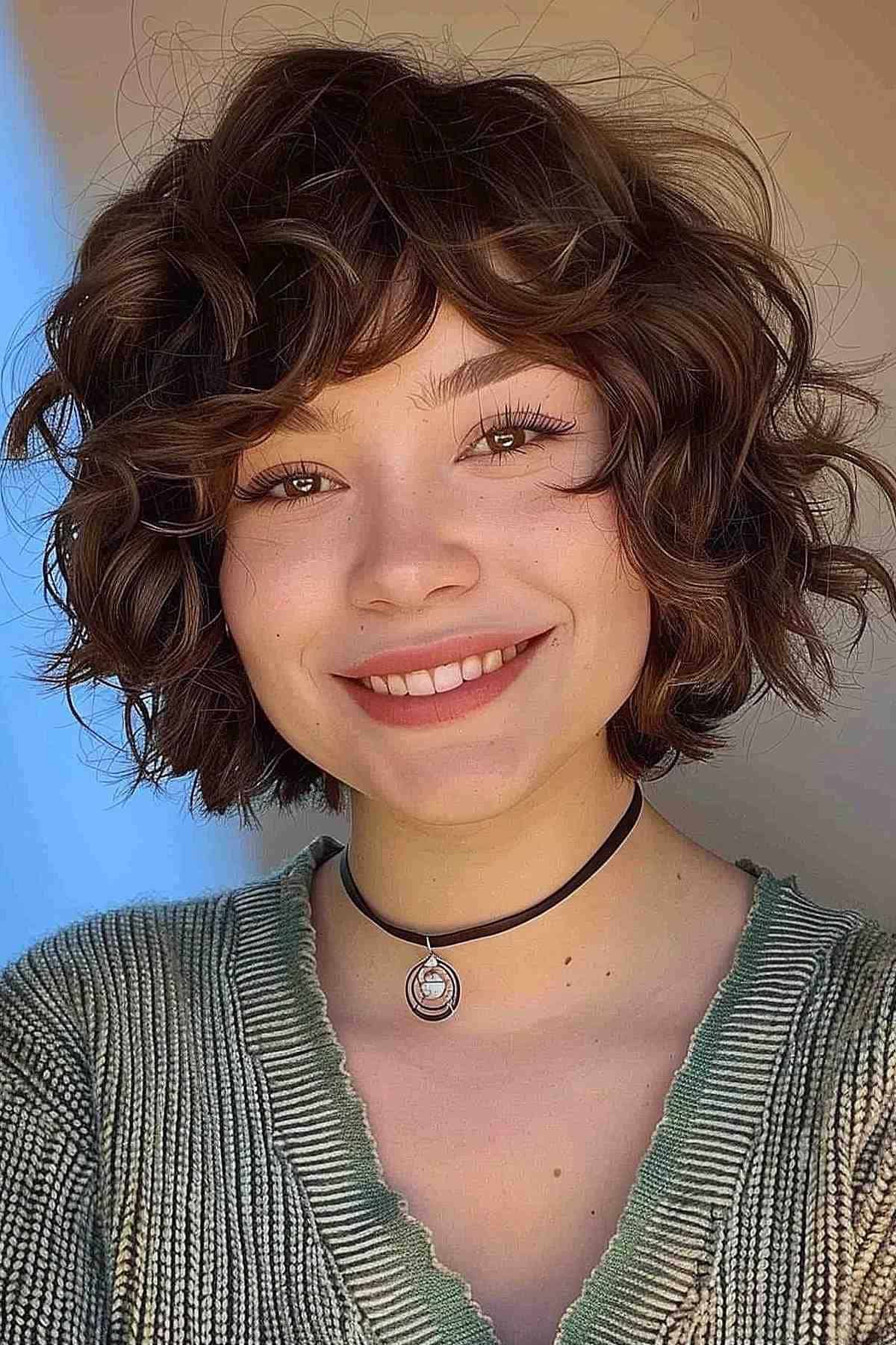 The Ideal Bob for Dark Brown Curly Hair is a stunning and versatile haircut that highlights the natural beauty of dark, curly locks. This cut features a short length with shaggy layers that add volume and movement, creating a full and lively look. It’s perfect for those with oval or heart-shaped faces, as the layers add dimension and the short length helps to balance the face’s proportions. The dark brown color adds depth and richness, making this cut ideal for those who want a bold and sophisticated look. To style, use a curl-enhancing cream and a diffuser to define the curls and add shine.