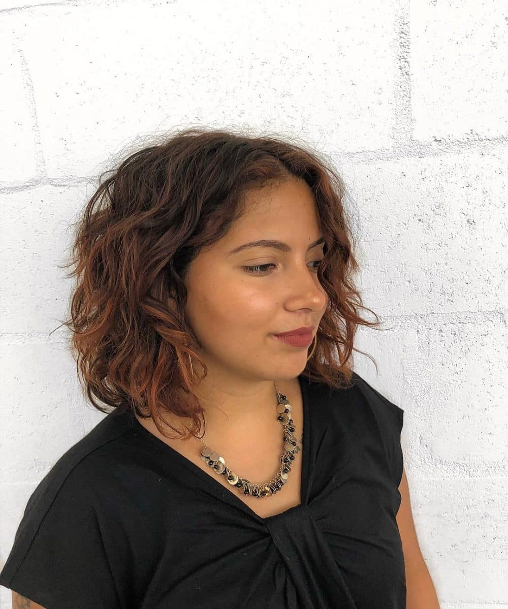 Short haircuts for round faces can benefit by incorporating messy waves with warm brown tones. The effortless and soft hairstyles and cuts that go over the chin create a balance to the entire look leaving an elongated but large curly hair.