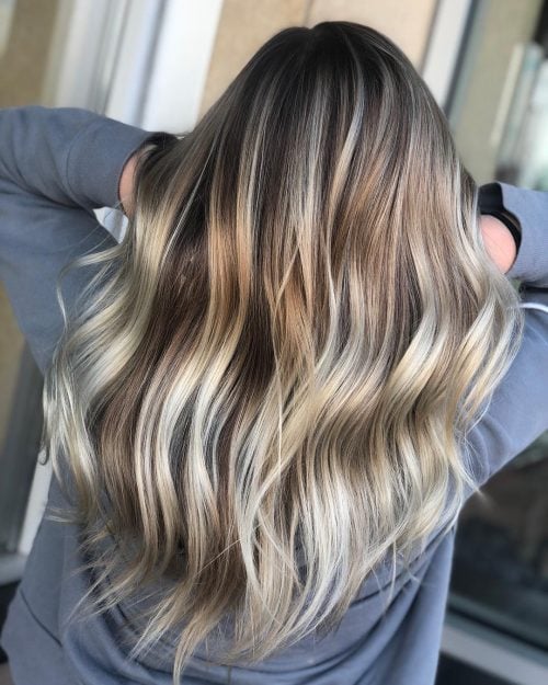 Bright white highlights on natural brunette shades create a stunning contrast, perfect for edgy, modern looks. This bold statement is great for those wanting high impact.