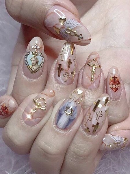 Angels symbolize goodness and hope and are considered to be messengers of God. If you’re someone who believes in God and would like to display that faith, you could make your nails a tribute to religious symbols. This is a bold move because it lets people know what you believe, but it can also result in amazing and captivating nail art that is an interesting conversation piece. The symbolism of Mary and crosses, stars and angels are a few options to be put together to create a stunning manicure. The detail on each nail suggests it’s best to have longer nails since this will allow more space for the design to be completed and will not be overworked. It is possible to play around with different ways to place them and then add the rhinestones to create an extra sparkly look.