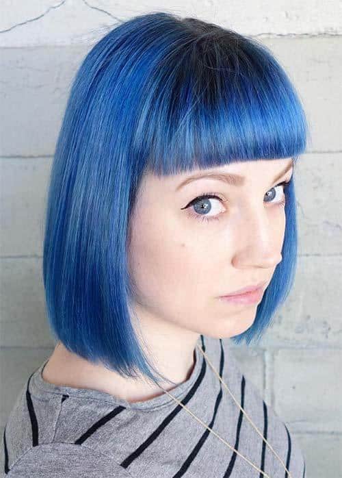 Electric cobalt delivers instant impact and photographs beautifully. A longer bob with sleek fringe gives the bold hue a chic, wearable frame. Maintain tone with a blue-safe, sulfate-free routine. Glossing drops create a lacquered finish. Straight styling emphasizes the saturated color payoff.