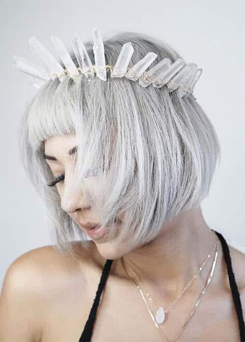 Frosty silver paired with sleek straight bangs lends regal flair and precision. The sharp outline frames the face beautifully and photographs with mirror-like shine. Protect the tone with violet care and low-heat styling. A crystal hair accessory elevates the ice-queen aesthetic for events. Regular trims keep the hemline crisp and geometric.