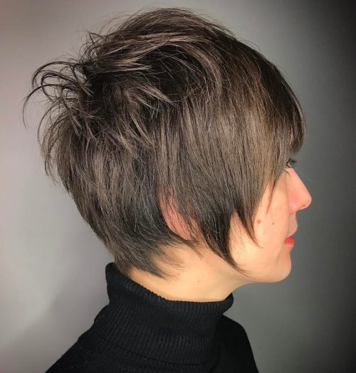 This punk-kissed pixie shag features wispy sideburns and a tousled, rebellious crown. Soft ombré from deep roots to smoky blonde or gray adds depth and attitude. The elongated top flatters round and square faces by adding height. Scrunch with salt spray and twist random bits with paste for lived-in texture.