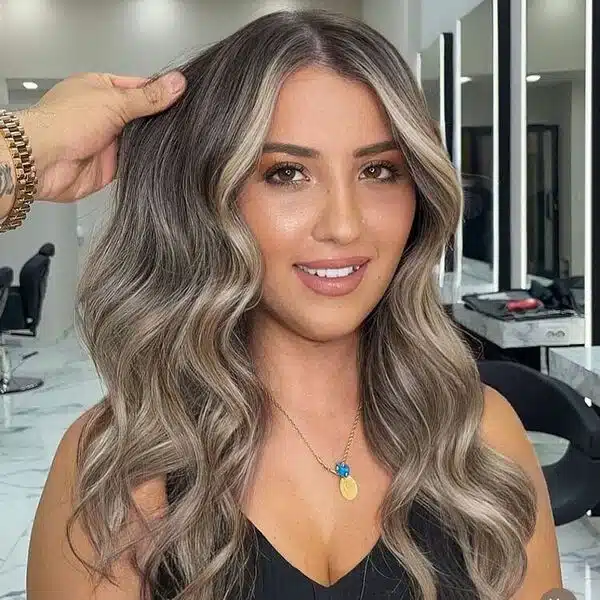 First , we have an ash blonde look. The stylists have added streaks of ash-blonde color to their long, brown locks. Then , they split the hair in the middle, and added chic beach waves. This look is stunning all through the year.