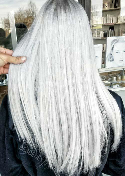 This vibrant silvery white look on gray hair is a bit edgy due to pin straight hairstyles, as well as dark hair roots that give it an element of mystery.