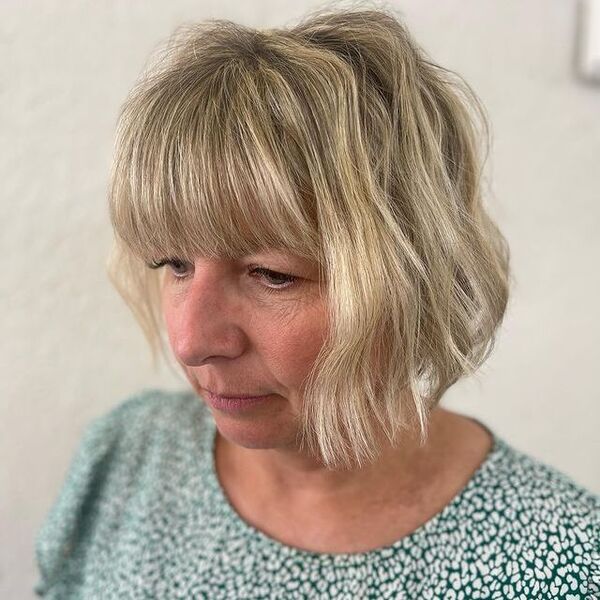 Short hairstyles that are suitable for women who are older are trendy since they prefer lighter colors to hide the gray spots. In this look, she has flawlessly colored her hair to a sandy blonde with a messy look. It’s possible to wear this look either with bangs or not.