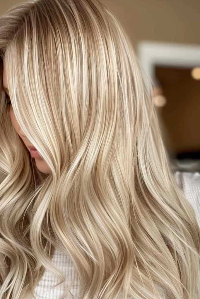 Here’s light blonde hair that has lowlights that match an enchanting long and wavy look. These intense, bold, golden lowlights work well with delicate, thin hair. They create the illusion of thicker hair. They’re the naturally golden tone which give it a chic Barbie-like look.