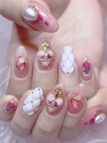 The appeal of nail art is that it can be any kind of nail art. It allows you to choose the style you prefer and can be symbolic, as using angel nails. Angels are associated with goodwill and innocence, love and wisdom, so including images of celestial beings can make an elegant and carefully planned manicure. There are a variety of ways to incorporate angels, from religious pictures to cherubs with hearts or arrows. Find the one that you prefer the most. To place your stickers at the centre of your outfit opt for a muted base color such as white, pink, or a neutral color.