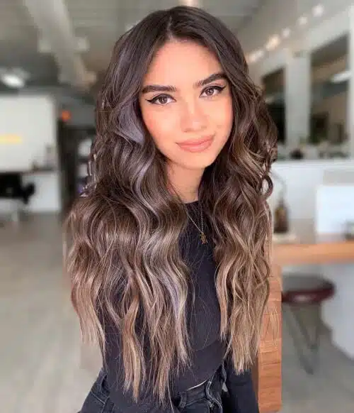 The cool hairstyle, which is ashy brown, is flawless in every aspect as well as the flawless mix, the stunning cool shade, and the amazing waves. This shade can be worn for months and only use a toner to revive the cool brown color when you keep your hair’s roots naturally.
